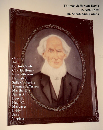My 2nd great grandparents, Thomas Jefferson Davis and Sarah Ann Combs, were married. T.J. was the son of Caleb Davis and Lydia Bartley. Sarah was the daughter of John Combs and Miss Bowman. It is speculated that Sarah is of Indian descent, but I have no proof. Thomas J. and Sarah had fifteen children. Thank you to Betty Campbell Yates for this picture of our ancestor and the great historical information she has passed on so generously.