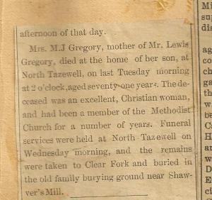 My 2nd great grandparents were married. Mary Jane Daugherty (John L.,John, John) and Daniel Parham Gregory (John Keatts, William, John, Thomas III, Thomas II, Thomas, Richard). They had six children and were laid to rest at the Daniel Gregory Cemetery in Clear Fork, Tazewell County, VA. Mary Jane was the granddaughter of Tazewell County pioneer, David Ward. Her brief obit is preserved in an old scrapbook belonging to her namesake granddaughter, Mary Jane Davidson.