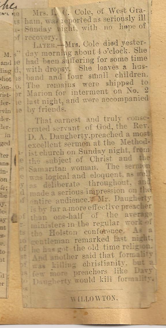 In Grandmother’s clipping below we read kind words apparently said by Reverend Daugherty proclaimed at the funeral of a dearly departed.