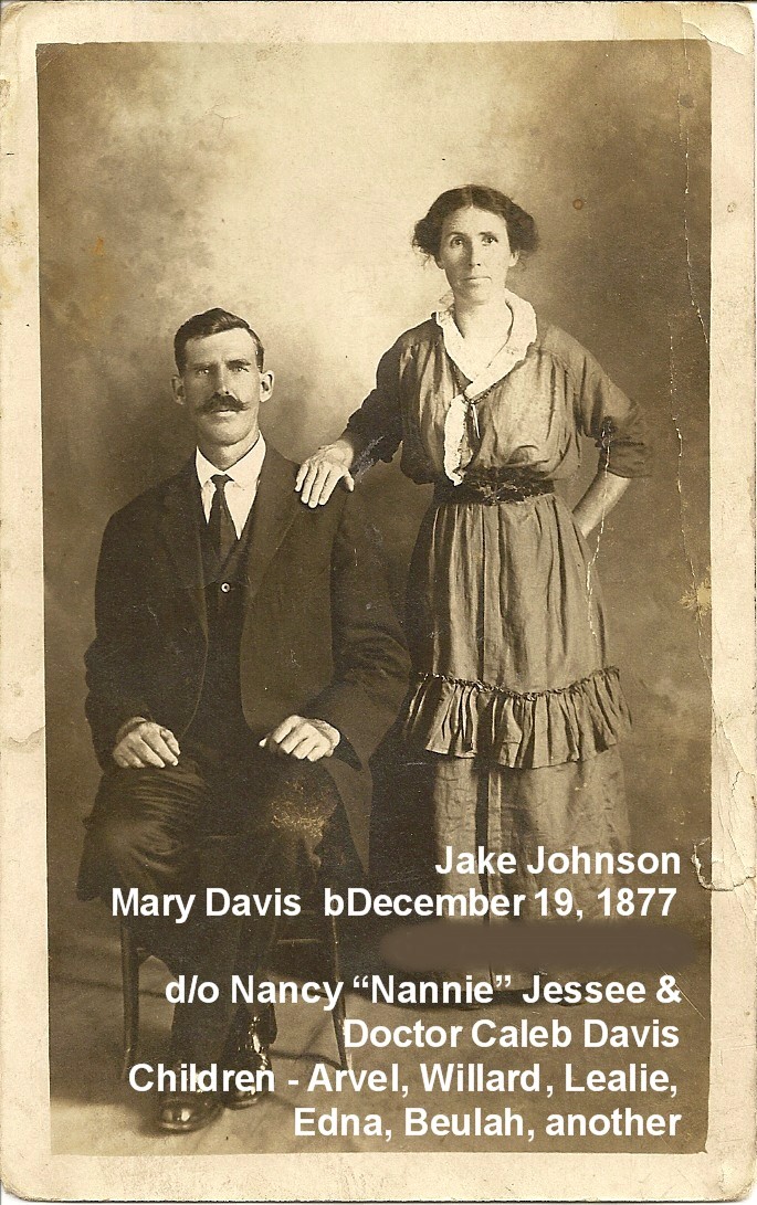 Genealogy is not for those who are gratified by the completed task because family historians are always in search of the next perfect piece to fit the puzzle. Little more than 30 years ago, after a lifetime of practically ignoring my family, I became interested in my ancestors. The journey began, as most genealogists suggest, by asking question of your parents. I discovered a good bit of first-hand information from Dad about his side of the family. Mom however, knew very little about her lineage probably because she was the eighth born in a family of ten children. Her DAVIS grandfather had passed away in 1899, long before her birth and her grandmother Nancy C. “Nannie” (Jessee) Davis passed away when her namesake, Nannie Lucille Davis, was only four. I have no pictures of Doctor Caleb Davis (1853-1899) and only the one of Nannie. (below on right)